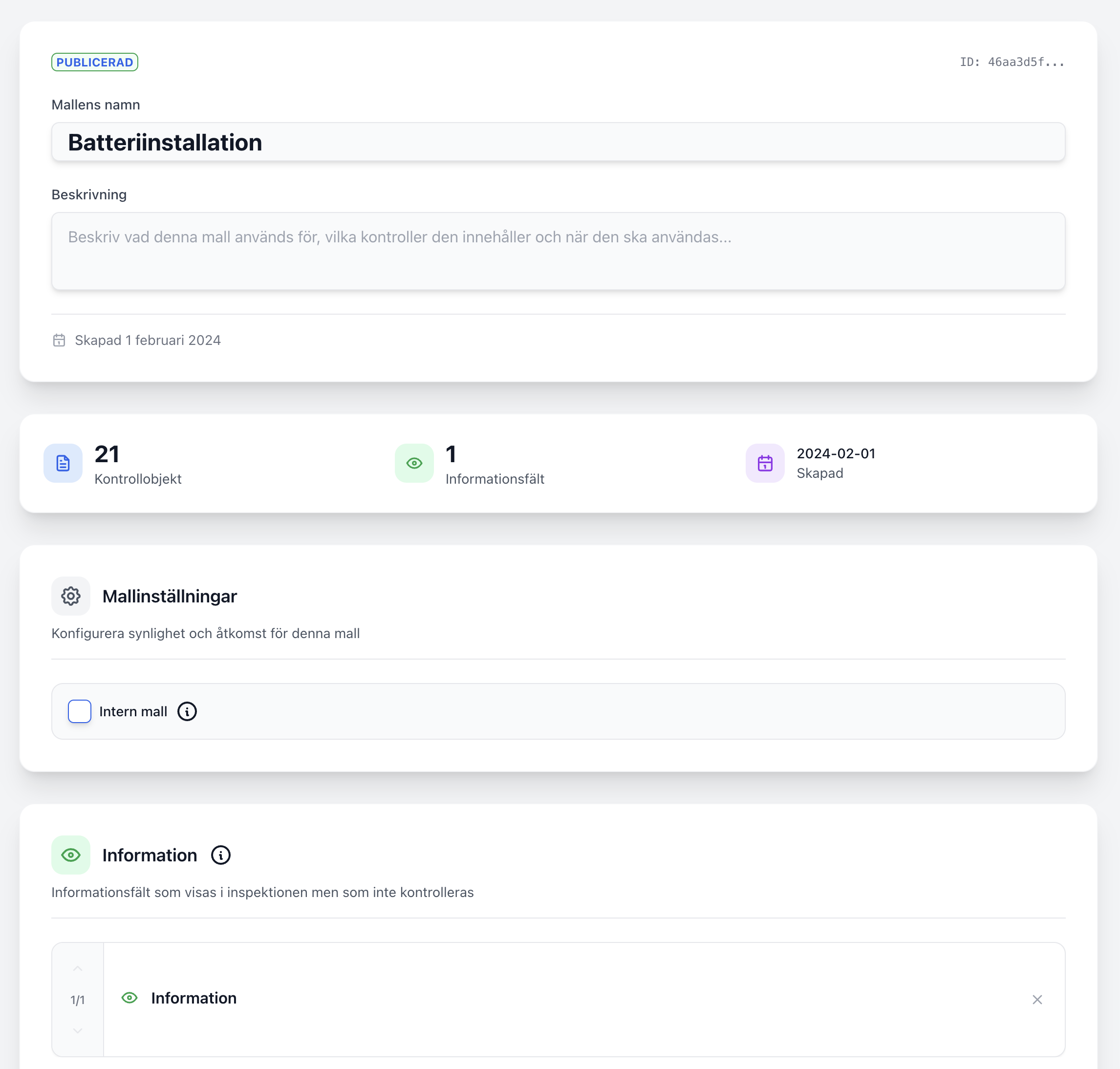 - Skräddarsy de mallar ni behöver. Baserat på en mall skapas sedan egenkontroller för respektive kund.